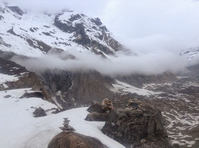 Пять утра. Будильник. Выходим встречать рассвет. Выходим и тут же возвращаемся обратно в теплые спальники - на улице нет ни солнца ни гор, ничего нет кроме плотной облачности. Ставлю будильник на 5:30 - вдруг распогодится. Не распогодилось. Молоко. 6:00 - молоко. 6:30 - молоко. 7:00 - молоко, но пора вставать, уже не спится. Все треккеры грустные уходят вниз. Я достаю карту и думаю как быть.Очень хочется все же увидеть всю панораму, весь "цирк" вершин окружающих Annapurna Base Camp. Ведь мы сюда топали ради этого. Смотрю на карту: если завтра и послезавтра устроить марш броски то сегодня можно остаться в Base Camp и кто знает, может переседим непогоду и таки насладимся чистыми, открытыми вершинами. Озвучиваю идею брату - он за.